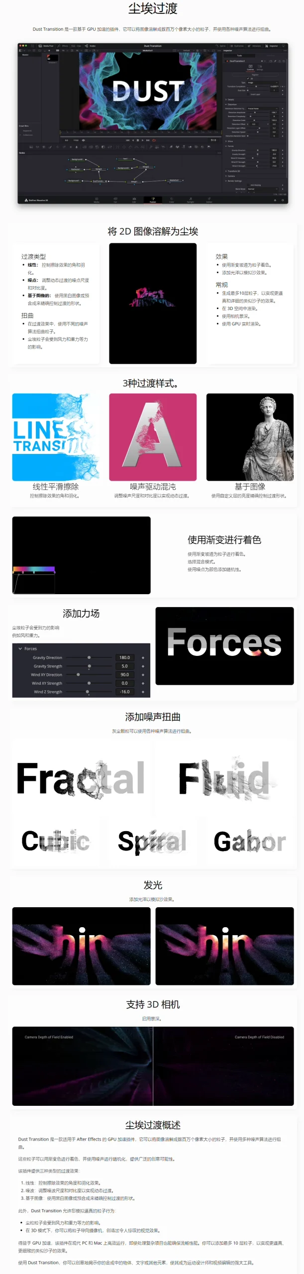 ✨ Dust Transition是一款专为DaVinci Resolve和Fusion设计的GPU 加速转场插件。它可以将画面分解为数百万个像素级粒子,并通过多种噪波算法实现扭曲与溶解效果,为视频制作带来炫酷的粉尘粒子消散转场。