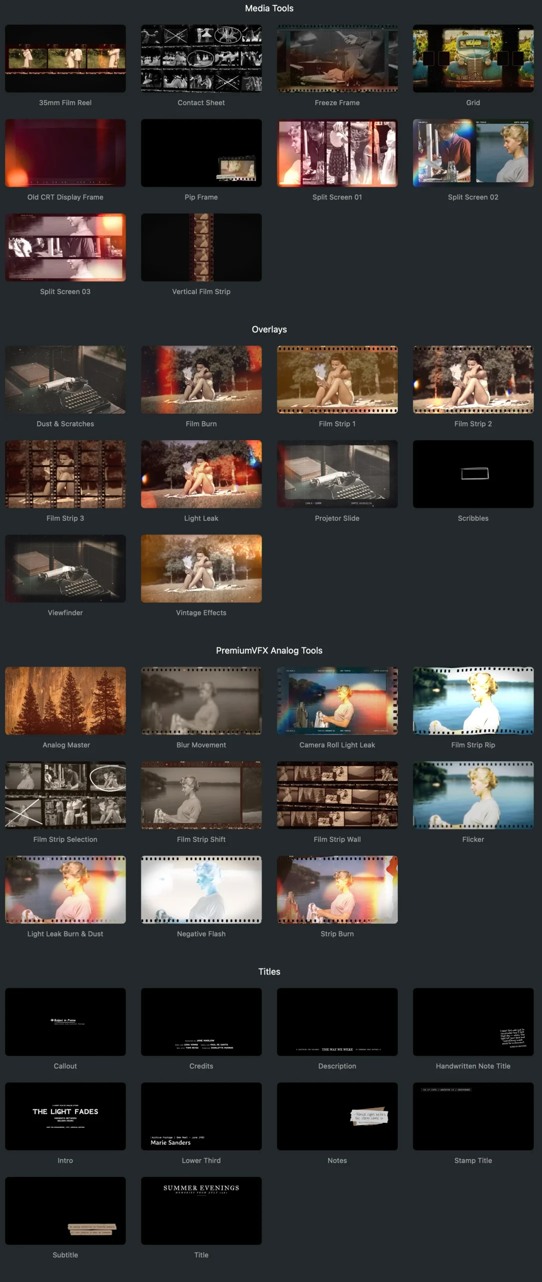 Film Look 视觉包精心模拟传统胶片的粗粝纹理、光晕、烧片、撕裂、色偏、漏光等特征,将怀旧美学完整移植到 FCPX。无论用在 音乐视频、纪录片、旅行 vlog、剧情短片、广告、艺术项目,都能瞬间营造真实的复古质感