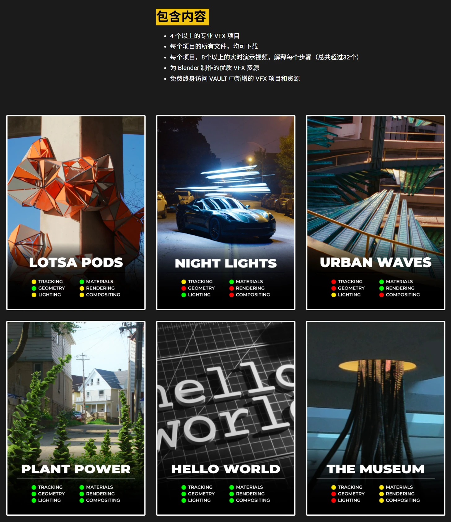 本教程讲解使用Blender掌握将照片级真实CGI添加到实拍镜头中的工作流程!包含CORE 和 VAULT两个部分,CORE核心旨在以最清晰、简洁、引人入胜的方式,教你3D视觉特效工作流程的理论和基础知识,VAULT部分包含4个实例,包括多边形生长、夜晚汽车合成、阶梯动画、植物动画,完整讲解每个视觉特效镜头的制作流程。