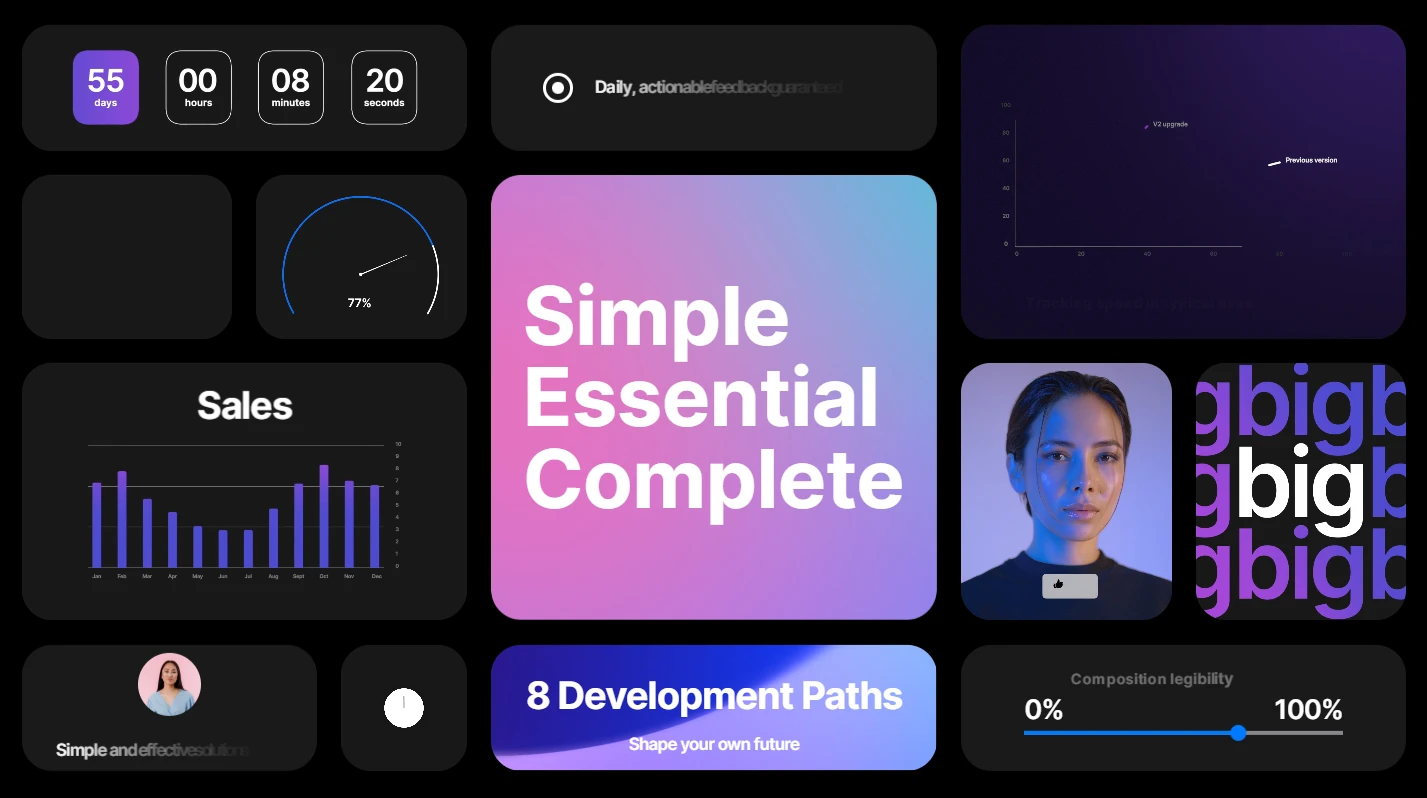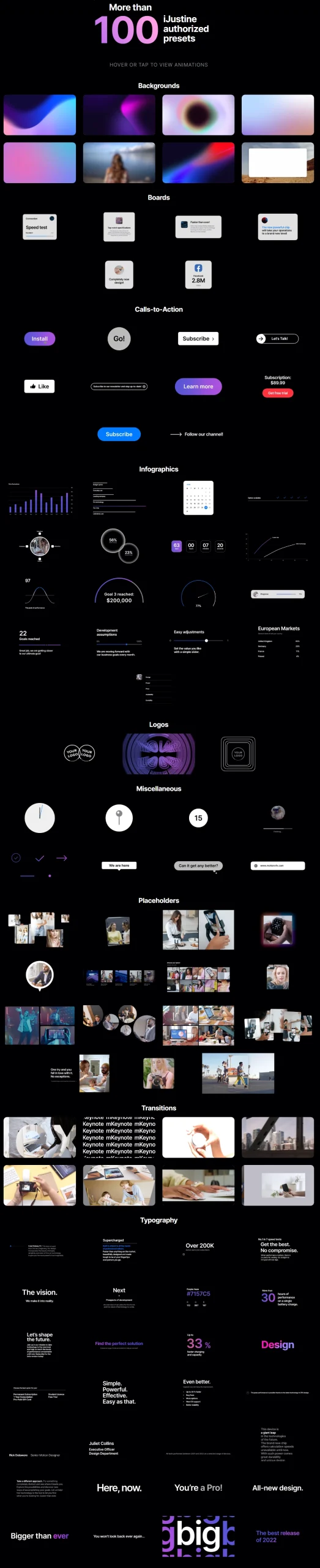 这套mKeynote数据图文展示动画预设包 为达芬奇与Final Cut Pro用户提供了95组高质量标题、信息数据、图片展示、背景元素与排版动画。所有模板均可高度自定义,适合用于 宣传片、科技展示、教学演示、企业汇报、短视频包装 等各类视觉项目。