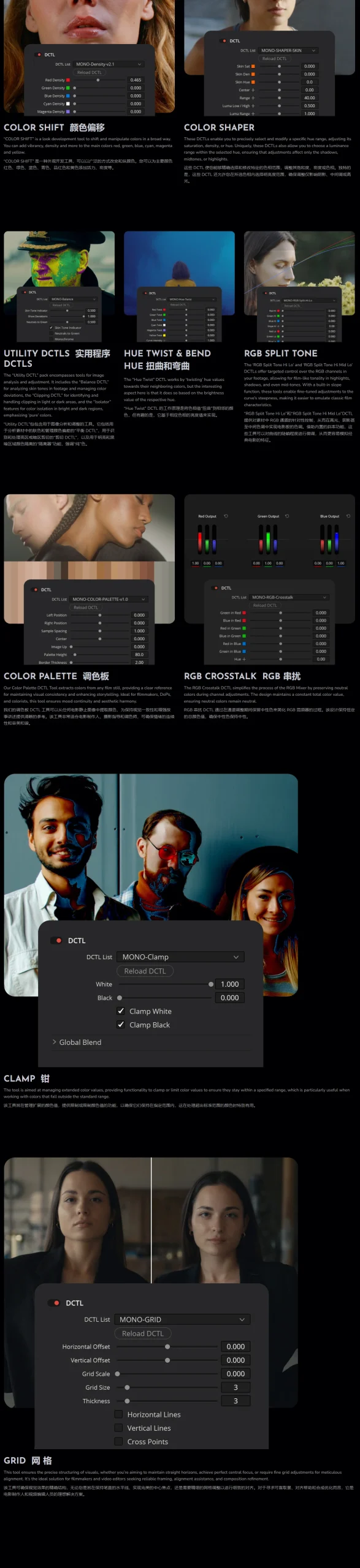 🔥 Mononodes – Color Shift DCTLS V4 /Utility DCTL V2/Hue Twist V2/Grid/RGB Crosstalk/RGB Split/Clamp/Color Palette/Color Shaper 正式版13套达芬奇电影质感视频调色插件DCTL节点预设+中文字幕教程合集