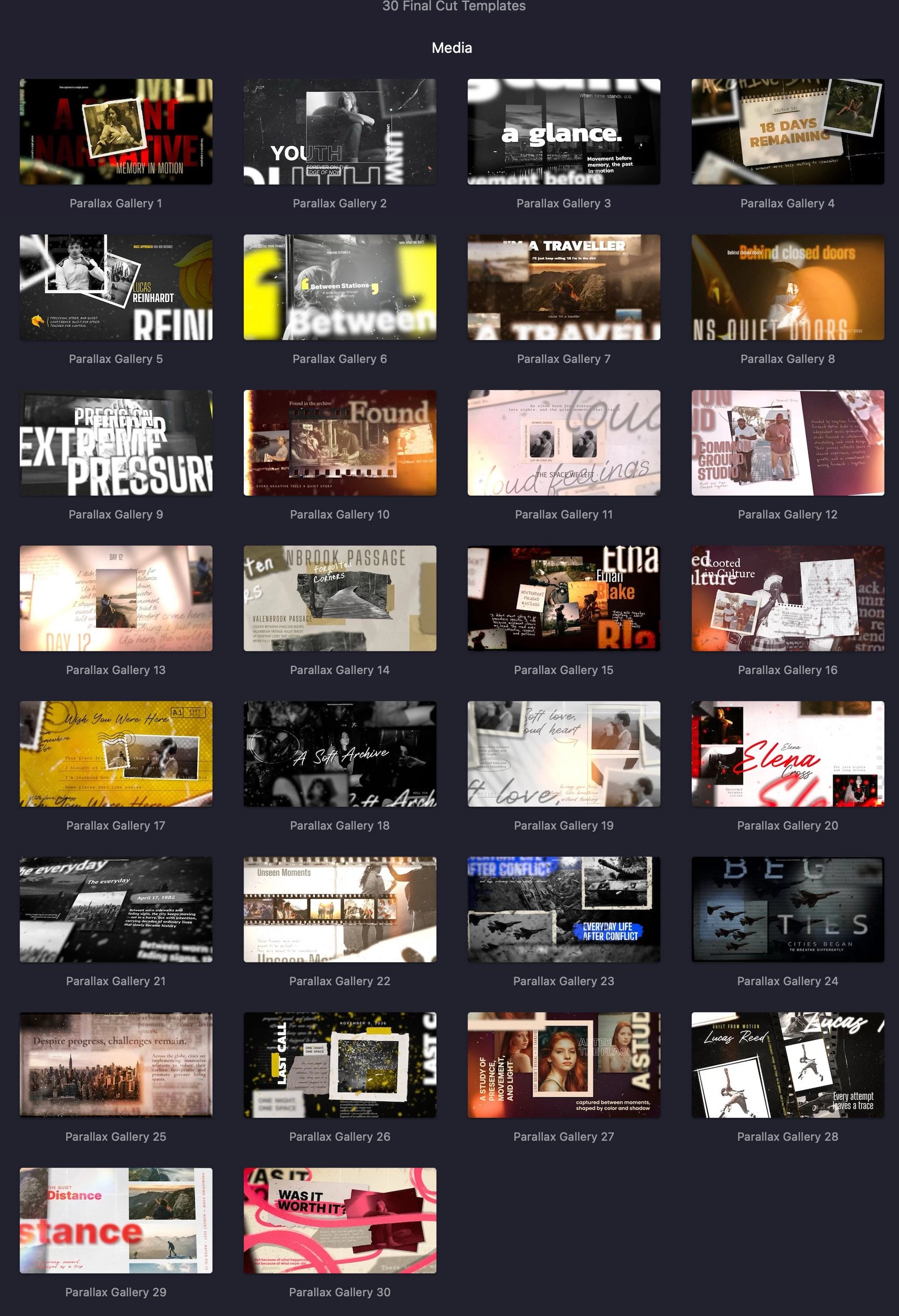 30种FCPX复古怀旧美学视差画廊图文展示动画插件