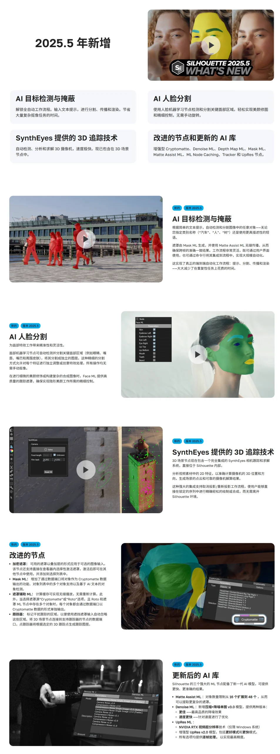 Silhouette 2025.5是由Boris FX推出的行业顶级旋转描绘 (Roto)、涂抹修复 (Paint) 与 VFX 合成工具。全新版本集成强大的AI 对象检测、AI人脸分割、SynthEyes 3D跟踪、ML 增强库等多项升级,让抠像、修图、跟踪、合成的效率与精度全面飞跃。